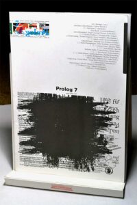 Kleine Prolog-Geschichte: Nach einem halben Jahr Vorbereitung erschien Prolog Nr. 1 am 17. November 2007 und die erste Ausstellung (17. November bis 1. Dezember 07) fand in der Raumer Str. in Berlin statt. Seitdem erscheint das Heft fortlaufend und bietet mit jeder neuen Ausgabe und jeder weiteren Ausstellung eine Plattform für Künstler & Autoren & Enthusiasten.